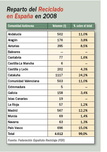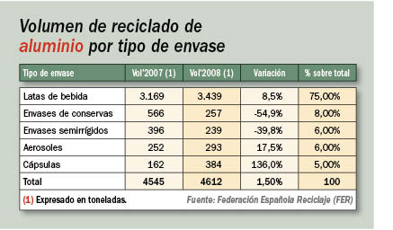 El pasado ejercicio se reciclaron en España 4.612 t de envases de aluminio empleados en gran consumo (entre latas de bebidas, envases de conservas, semirrigidos y aerosoles) y productos farmacéuticos (entre envases y blíster para capsulas y otros medicamentos), cifras que representan una subida del 1,5% en relación a 2007, según la Federación Española del Reciclaje (FER).