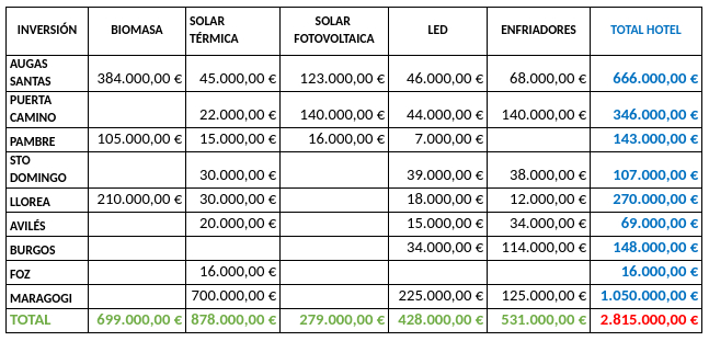 En cuanto al consumo eléctrico de los hoteles, mediante la implantación de detectores de paso en las zonas comunes y la sustitución del 100% de los equipos de iluminación convencional por equipos led se ha reducido el consumo eléctrico en un 85% en cada hotel, con una emisión que va desde los 23.177 kilos de CO2 menos al año, dependiendo de la unidad. Se han sustituido los grupos convencionales de bombeo de climatización y agua caliente y saneamiento, por grupos de bombeo con variador de frecuencia, consiguiendo ahorros de hasta el 30% y 1.143 kg de CO2. Se sustituyen también todos los fancoils de climatización en las habitaciones, reduciendo el consumo en un 36,6% y las emisiones en 11.627 kg de CO2.