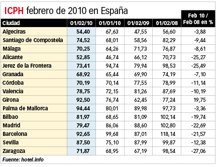 El ICPH (Índice de Precios Hoteleros) de febrero de 2010 elaborado por el servicio de reservas hoteleras online hotel.info indica una tendencia hacia la estabilización de los precios de las habitaciones por noche. A pesar de que los precios siguen por debajo de los de febrero de 2008, sí han conseguido superar el nivel de los del año pasado en estas mismas fechas. Esta evolución positiva de las tarifas hoteleras es aplicable tanto a nivel europeo como mundial.