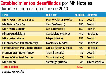 En los tres primeros meses de 2010, Nh Hoteles ha procedido a la venta de cuatro establecimientos, operaciones que han reportado al grupo ingresos de 117 M€. En concreto, el pasado mes de febrero, vendió tres hoteles en México operados bajo franquicia de Hilton, así como la marca vacacional 'Krystal' , junto con tres contratos de gestión sobre establecimientos operados con dicha enseña. Mientras, recientemente firmó un acuerdo de venta para el londinense 'Jolly Hotel St. Ermin's' . Por otro lado, Nh Hoteles ha cancelado los contratos de otros siete hoteles en el primer trimestre de 2010 dentro de su plan de gestión de activos no rentables y/o no estratégicos. Así, el grupo ha reducido significativamente su presencia en México, especialmente en el segmento vacacional del país, que ha abandonado, tras dejar de operar 7 hoteles, con 2.658 unidades alojativas. Asimismo, ha desafiliado dos hoteles en Italia, ambos en Taormina (Sicilia) y uno en Salzburgo (Austria).