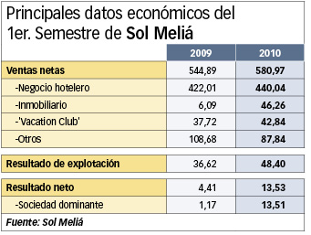 Las cuentas semestrales de Sol Meliá, presentadas ante la CNMV, muestran una significativa mejora de la actividad del grupo, incluyendo un importante incremento del 15,5% en el ebitda hotelero, el primero tras nueve trimestres de retroceso en este ratio. Así, las ventas consolidadas de la mallorquina alcanzaron los 581 M€ (+7%), de los que 440 M (+4%) proceden de la actividad hotelera y 43 M (+13,5%) de la división 'Sol Meliá Vacation Club'. Igualmente, el resultado de explotación muestra un avance del 32%, hasta los 48 M€, mientras que el ebitda crece un 13% hasta los 97 M y los beneficios se triplicaron con respecto al primer semestre de 2009, alcanzando los 13,5 M.