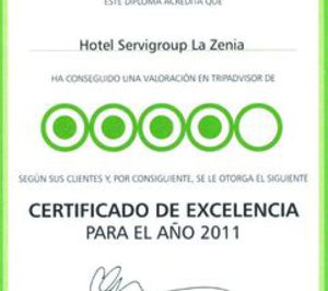 Hoteles Servigroup ha recibido cinco Certificados de Excelencia para el año 2011 por parte de TripAdvisor for Business para los hoteles 'La Zenia' (4E-220 habitaciones), de Orihuela (Alicante); 'Marina Playa' (4E-334), de Mojácar (Almería); así como 'Rialto' (3E-103), 'Torre Dorada' (3E-243) y 'Pueblo Benidorm' (3E-530), estos tres de Benidorm (Alicante). El grupo hotelero es merecedor de este certificado por haber obtenido una valoración de 4 sobre 5 por parte de los usuarios del establecimiento hotelero a través del portal, lo cual indica el alto nivel de satisfacción, fruto de las buenas puntuaciones que han obtenido los hoteles de forma continuada por parte de los usuarios de TripAdvisor.