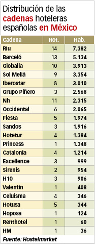 Aunque es pronto para vaticinar qué efectos económicos causará la crisis de la gripe A (hasta ahora conocida como gripe porcina o nueva gripe), no cabe duda de que el turismo, y en concreto el español, que tiene en México uno de sus principales pilares, será uno de los sectores más afectados. En total, 22 cadenas españolas están presentes en el mercado azteca, gestionando un total de 112 hoteles y 41.754 habitaciones. Por número de habitaciones, las hoteleras españolas con mayor presencia son Riu y Barceló, cuyos establecimientos son exclusivamente vacacionales y se encuentran fuera de México D.F. y del estado de San Luis Potosí, las zonas con más muertes registradas en lo que va de crisis. De toda la hotelería española, sólo Hotusa (3), Nh (3) y Sol Meliá (1) cuentan con activos en la capital del país. Ésta última ha adelantado que la operación de sus hoteles mexicanos en los meses de abril y mayo, en plena temporada baja, apenas supone un 1,04% de sus ingresos, por lo que prevé un impacto moderado.