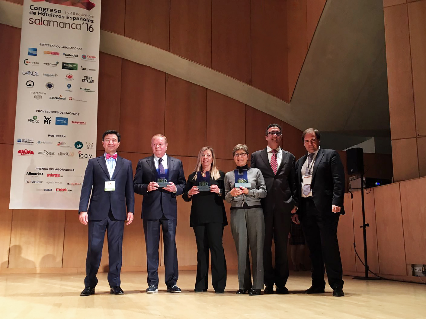 Los galardones han sido entregados por Manuel López, CEO de Grupo InterMundial y patrono de Fundación InterMundial Seguros, Javier del Nogal, director general de Tourism & Law y patrono de Fundación InterMundial Seguros, y David Hoyos, director de Tourism & Law, durante la ceremonia de clausura del Congreso de Hoteleros Españoles.