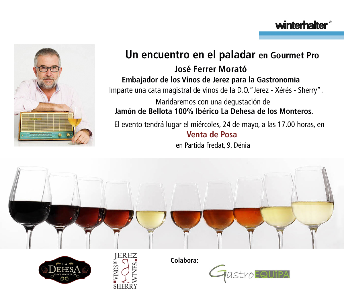 Winterhalter Ibérica organiza dos nuevos eventos bajo el título “Un encuentro en el paladar”. Por un lado, el martes 23 de mayo la cata tendrá lugar en Lab Ricard Camarena y en ella se podrá disfrutar de una magistral cata de vinos Denominación de Origen “Jerez-Xéréz-Sherry” impartida por José Ferrer Morató, embajador de los Vinos de Jerez para la Gastronomía.