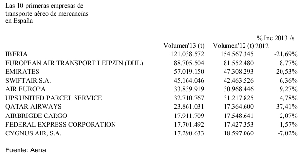 El movimiento de carga aérea en los aeropuertos españoles descendió un 2% en 2013, según los datos de Aena. El recorte de actividad de un 4,2% en Madrid-Barajas, que con 345.802 t representa más de la mitad del total movido en España (638.087 t), impidió una mejoría que sí se registró en los otros tres aeropuertos importantes en esta actividad: Barcelona-El Prat (+3,9%, hasta las 100.297 t); Zaragoza (+0,7%, con 71.661 t) y Vitoria (+8,2%, 37.482 t). Aún así, el descenso general es levemente inferior al de 2012, que fue del 3,1%, con Madrid-Barajas cayendo entonces un 8,4%. Asimismo, diciembre de 2013 marcó un viraje positivo, con un aumento del 4% en la carga aérea respecto al mismo mes del año anterior (+5,1% en Madrid-Barajas).