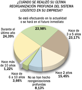 Aparte de una necesaria adaptación a la coyuntura actual, el área logística de las compañías vinculadas a los sectores de gran consumo no deja de ser una de las más actualizadas y reformadas permanentemente. Así, nada menos que un 84,5% confirma que realiza una revisión o cambios en su sistema logístico de forma continuada, aunque la mayoría son de carácter leve, concretamente un 41,4% del total. Alterna cambios leves y profundos en su logística un 38,2% de los encuestados y exclusivamente un 4,8% se ven obligados a una realizar periódicas revisiones de profundo calado. Sin embargo, la envergadura de las reformas actuales se revela cuando se les cuestiona por el momento que se llevó a cabo la última reoganización intensa en su cadena de suministro: un 24,3% señala que durante el último año y un 23,9% avanza que se está registrando en estos momentos o se hará en el futuro inmediato; es decir, casi una de cada dos está hablando en presente. Aparte, un 23,1% indica que esta reoganización profunda la efectuaron hace de 3 a 5 años; un 15,4%, hace dos años; y un 8,1% no la han llevado nunca a cabo.