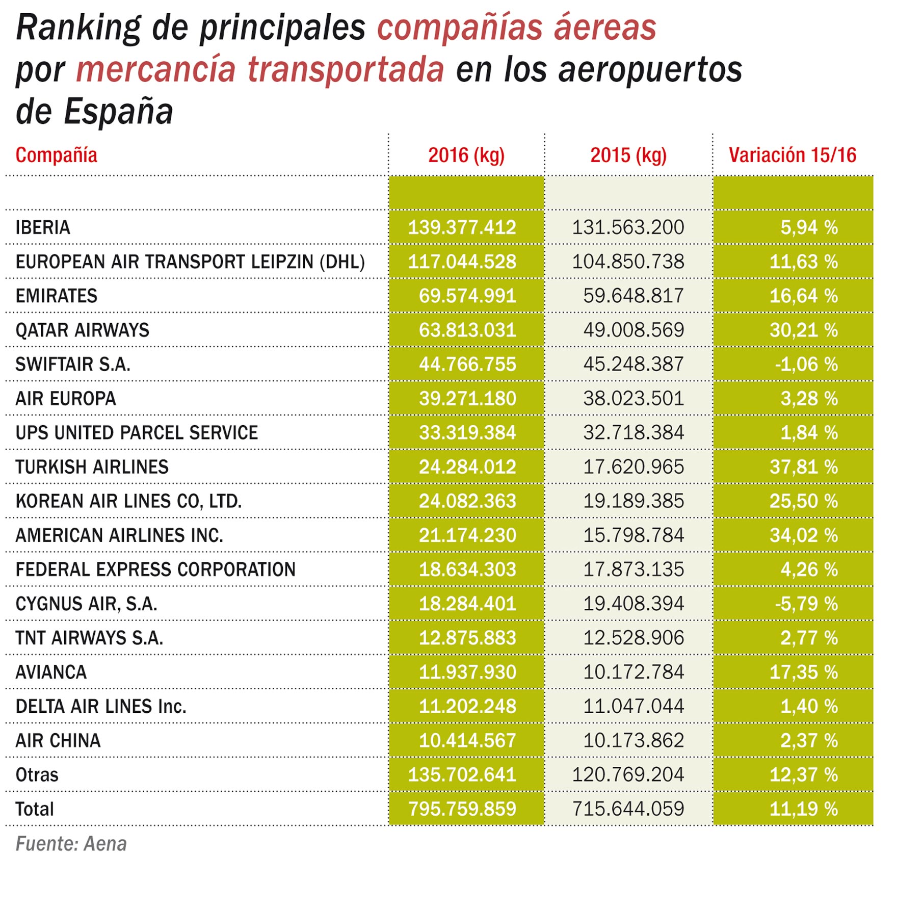 Iberia ( IAG Cargo ), como la clásica aerolínea de bandera, que cubre los trayectos nacionales -los insulares tienen gran incidencia en mercancías-, se sitúa a la cabeza como compañía de carga aérea en nuestro país, tras un crecimiento el 5,94% y cerca de 140.000 t transportadas. Tras ella, el grupo alemán DHL , con unas 117.000 t y aumentando sus cifras un 11,63%. Esta expansión le ha hecho animarse a acometer importantes inversiones en España , con nuevas instalaciones de soporte en los aeropuertos de Madrid-Barajas -que supondrán un presupuesto de 47 M€ para ser inauguradas a mediados de 2018- y Vitoria -con apertura en julio de 2017, tras 23 M€ de inversión-.