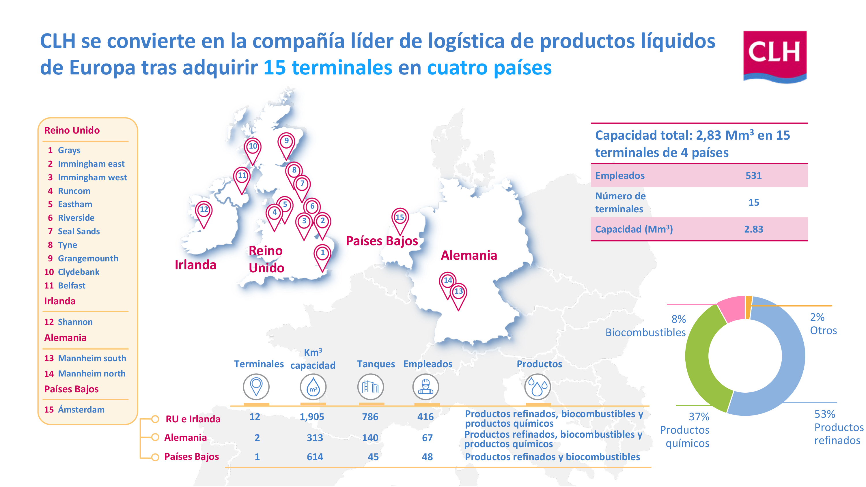 La operación permitirá incorporar 15 terminales de almacenamiento de productos líquidos a la red que tiene actualmente CLH, con lo que la compañía se convertirá en la principal empresa de almacenamiento de este tipo de productos en Europa y pasará a estar presente en 8 países.