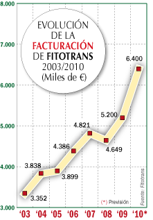 El operador logístico de productos químicos y fitosanitarios Fitotrans , con sede en Valladolid, ha superado durante los nueve primeros meses de año la previsión de ventas que ya adelantó en enero pasado y espera finalizar el presente año con un crecimiento en su facturación del 28%, frente al 23% inicial. La compañía espera así superar ampliamente los 6,4 M de ingresos previstos en 2010 y acabar ejercicio con unas ventas de más de 6,65 M€, frente a los 5,2 M que facturó en 2009.
