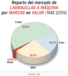 En el lavado a máquina, Reckitt Benckiser mantiene su hegemonía con su enseña ‘Finish’, que ha potenciado en el último año en sustitución de ‘Calgonit’ -tras unos meses de convivencia de la marca ‘Finish Calgonit’- dentro de la estrategia de la empresa de unificar su imagen de marca en todos los países en los que tiene presencia. Además, a finales de 2009 reforzó su gama de productos con el lanzamiento de ‘Finish Quantumatic’, un dispensador automático de detergente para lavavajillas que permite olvidarse de cargar la pastilla del lavavajillas durante 12 lavados, al disponer de un contador inteligente que indica cuántos lavados van restando. También su competidor Procter & Gamble añadió valor a sus productos y presentó, el pasado agosto, ‘Fairy Platinum’, cuyas cápsulas contienen un líquido de acción dual que, además de quitar la grasa de los platos, la elimina también del lavavajillas.