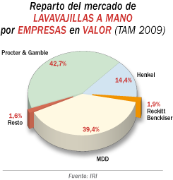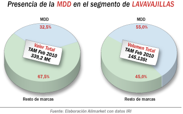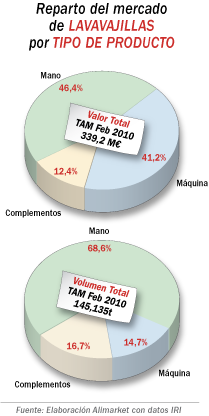 En el reparto por tipo de producto, los datos del TAM febrero 2010 de Nielsen sitúan a los lavavajillas a mano en primer lugar en ingresos, al acaparar un 45% de los 337,8 M generados en el sector, mientras los destinados para el lavado con máquina suponen el 40,4% de las ventas totales. Finalmente, los complementos (abrillantador, sal, ambientadores...) aportaron el 14,6% de las ventas. Cabe señalar que, en volumen, los complementos superan en cuota (20,5%) a los lavavajillas a máquina (14,8%), probablemente por la duplicidad en su uso, ya sea por el deseo del consumidor de potenciar el efecto de los lavavajillas que ya combinan en su formulación detergente, sal y abrillantador, o por el desconocimiento de esta repetición.