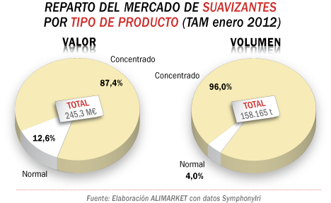 Desde que se iniciase la recesión económica, el mercado español de suavizantes ha sido de los menos afectados por el descenso del consumo, si bien en el último año también ralentizó su avance, tanto en volumen como en valor. En este sentido, este producto creció un 2,7% en volumen en el TAM enero 2012, según los datos de SymphonyIRI para este periodo. Entretanto, el incremento de las ventas generadas fue más moderado, del 1,1%. Ambos datos, aunque positivos, se mantienen por debajo de los niveles de crecimiento registrados en años anteriores. Destaca también la moderación de la progresión de la marca de distribución, cuyo avance fue de poco más de medio punto porcentual, en volumen e ingresos. No obstante, la categoría de suavizantes es, junto con la de lejías, la que tiene mayor penetración de MDD, ya que siete de cada diez suavizantes se elaboran con marca del distribuidor. En los ingresos, el peso de la marca blanca se reduce hasta algo más de la mitad de la facturación total (52%).