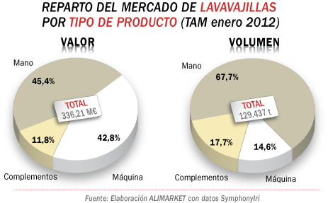Hasta el pasado ejercicio, la categoría de lavavajillas logró mantenerse estable frente a las bajadas registradas en buena parte de los productos de limpieza, especialmente los de detergencia. Sin embargo, los datos de SymphonyIRI para el TAM enero 2012 ponen de manifiesto que los productos para el lavado de vajillas también se vieron afectados por la contracción del consumo. El mayor descenso se registró en los volúmenes fabricados, que se redujeron un 4%, mientras los ingresos por estos productos retrocedieron un 1,6%. Este menor descenso en valor tiene su origen en el incremento de precios de algunas de las referencias analizadas. En este sentido, los lavavajillas para el lavado a mano y los complementos (abrillantador, sal y ambientadores) elevaron sus precios para compensar la caída de unidades comercializadas que, en el caso de los complementos, se debe a la cada vez mayor oferta para el lavado a máquina con referencias que incluyen en un mismo producto funciones propias de los complementos. Por su parte, los lavavajillas a máquina, que están acusando la menor venta de electrodomésticos lavavajillas como resultado de la crisis de la construcción, intentan estimular su demanda con una ligera redución de sus precios. De lograrlo, conseguirían acortar su distancia con los productos para el lavado a mano, algo que ya venían haciendo en periodos anteriores y que el pasado año se estancó en una diferencia de tres puntos porcentuales en valor.