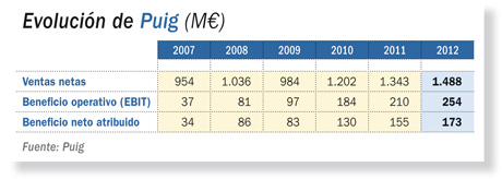 Con las cifras relativas a su último ejercicio la principal empresa de perfumería y cosmética de capital español, Puig , acaba de confirmar el acierto del plan que sigue para convertirse en una de las cinco principales compañías de perfumería selectiva a nivel mundial. Las cifras de 2012 la sitúan en el puesto número 6 del ranking, con una participación del 8,1%. Este plan ( Centennial ), al igual que los puestos en marcha en periodos anteriores, se basan en la internacionalización de la compañía, y la concentración en sus negocios de mayor recorrido.