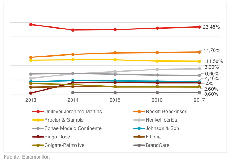 Evolución cuota de mercado en la higiene doméstica en Portugal (2013-2017)