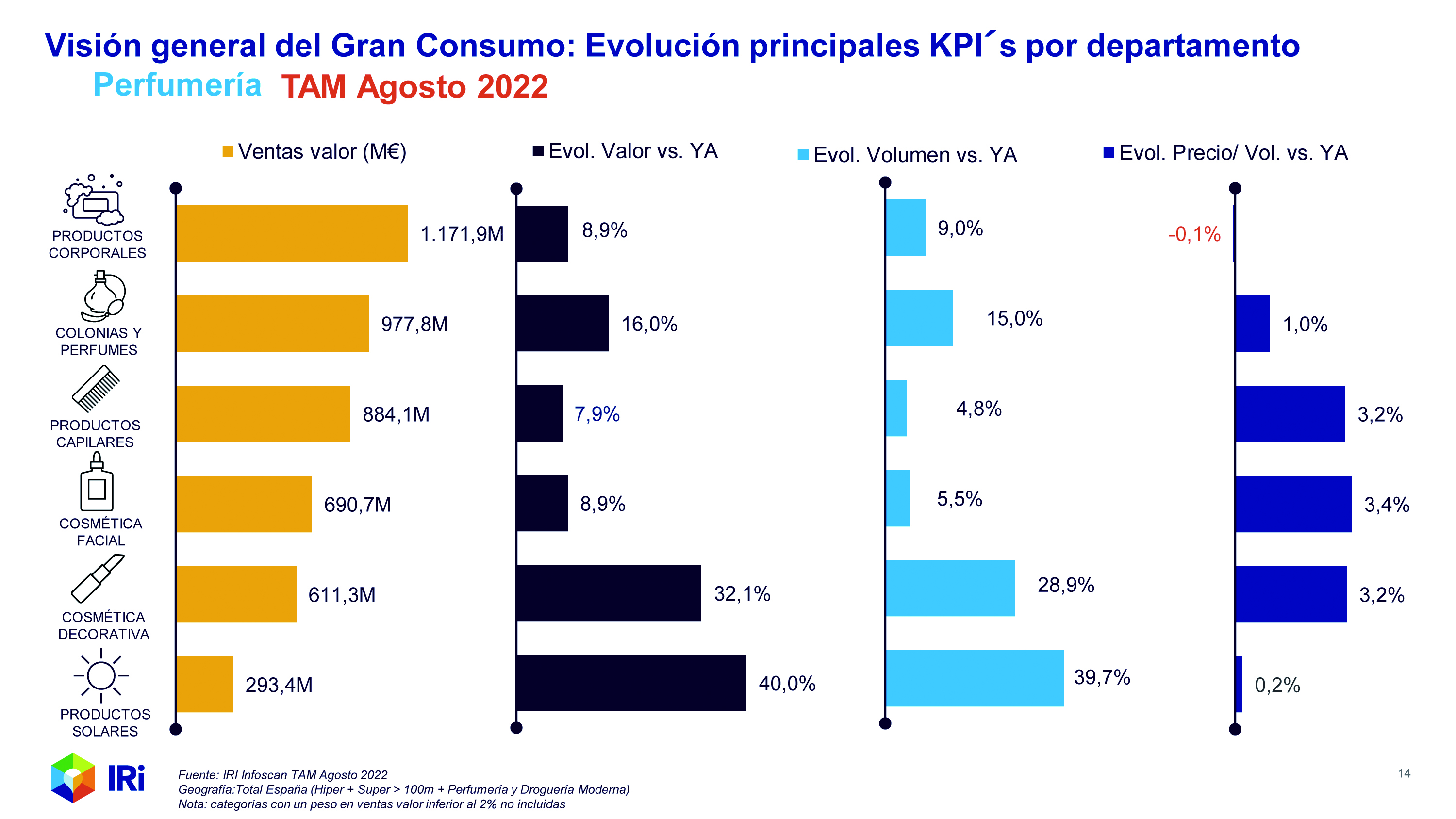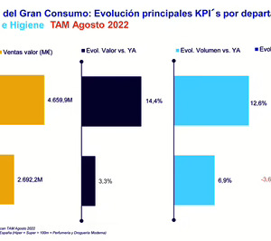 Estos datos no hacen más corroborar la recuperación del consumo de productos de perfumería e higiene una vez superado lo peor de la pandemia. Así, en el TAM finalizado en agosto de 2022, fue la categoría que más creció del Gran Consumo (10,1% en valor y 10,3% en volumen), con una rebaja del precio medio del 0,2%, probablemente por el aumento de cuota de las referencias con MDD en productos de higiene.