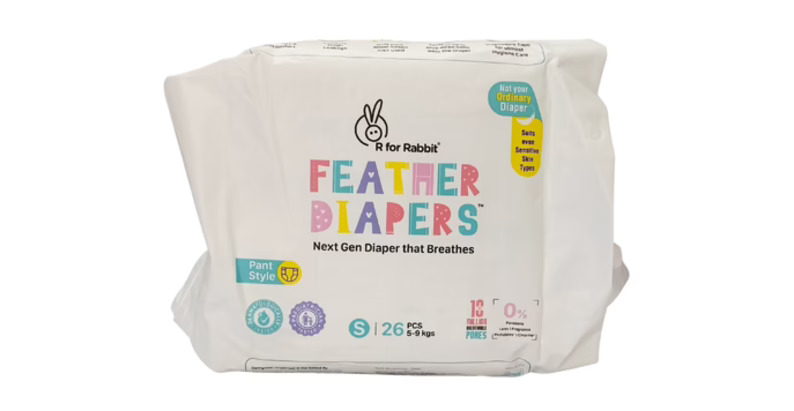 En el mercado indio, los pañales Feather Diapers by R for Rabbit (9) se presentan como “los pañales más transpirables de la India”. El fabricante destaca la ausencia de productos químicos y la idoneidad de este pañal para las pieles sensibles.