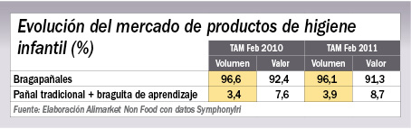 Con una presencia que apenas llega a rozar el 4% en volumen, las braguitas de aprendizaje han copado el grueso del crecimiento registrado por el mercado de los derivados de celulosa de higiene infantil en el último año, según se refleja en los datos de SymphonyIri, en el último Tam Feb 2011, en el que se recoge un crecimiento superior a un 18% en el tándem (pañal tradicional + braguita de aprendizaje), frente al 1,6% del segmento bragapañal. El crecimiento sería aún mayor sin el lastre que supone para este producto, de aspecto y uso similar a la ropa interior infantil, pero con la ventaja de la absorción, estar englobada en un único apartado con el pañal tradicional , de presencia apenas testimonial, y en franco retroceso.
