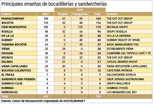 El subsector de las bocadillerías y sandwicherías cuenta en nuestro país con cerca de una quincena de enseñas con un total de 756 locales, lo que supone algo más de un 6% sobre la oferta del ejercicio 2007. No obstante, en este segmento están incluidos conceptos diferentes que incluyen desde la oferta más clásica, como las de los “Pans&Company” o los “Viena”, hasta los modernos “Delinas”, más cercanos al “casual food”, pasando por los “Cien Montaditos” o “Taberna Bocatín”, más próximos al modelo de taberna-cervecería.