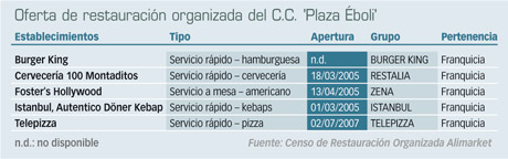 El grupo inversor norteamericano H.I.G. Capital ha anunciado la adquisición del C.C. 'Plaza Éboli', de Pinto (Madrid), a través de una filial no identificada. El complejo, que cuenta con una superficie de más de 31.000 m2, cuenta entre sus principales inquilinos con los grupos de distribución Inditex, H&M, C&A y Cortefiel. Su oferta de restauración está compuesta actualmente por ocho locales, de los que cinco pertenecen a cadenas de restauración organizada, tal como puede observarse en el cuadro adjunto. Hasta hace escasas fechas, además, también estuvo presente en el centro un establecimiento de la enseña 'Pans & Company', en cobranding con 'Pollo Campero', actualmente cerrado.
