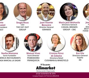 Para ilustrar sobre estas y otras tendencias y desafíos del mercado y las diferentes estrategias y modelos de negocio posibles, el Área de Restauración de Alimarket ha reunido para el IV Encuentro Alimarket Restauración Organizada otro elenco de primeras figuras de la restauración moderna, completando un programa dirigido tanto a los directivos y profesionales de las propias grupos y cadenas hosteleras, como a franquiciados, inversores, emprendedores y todo tipo de proveedores de bienes y servicios para las empresas de restaurantes, bares, cafeterías, cervecerías, tabernas, pizzerías, hamburgueserías, etc. De este modo, los asistentes al IV Encuentro Alimarket Restauración Organizada podrán escuchar las intervenciones de Malena Pato-Castel, Brand President y miembro del Comité Ejecutivo del grupo AmRest (Restauravia), que es líder de temáticos italianos con la cadena ‘La Tagliatella’ y primer franquiciado en España de 'KFC - Kentucky Fried Chicken'; Sergio Rivas, CEO de The Eat Out Group, quien desde febrero de 2015 está al frente del restyling y relanzamiento de marcas como las bocadillerías ‘Pans & Company’, las tabernas ‘Santamaría’ o los restaurantes americanos ‘Ribs’, así como de su división en el canal de viajeros; y Juan Vicente Bonastre, durante 25 años director comercial de Europastry y nombrado a finales de 2015 primer ejecutivo de Granier, con el objetivo de pilotar el plan estratégico a cinco años que está desarrollando la cadena de bakery coffee, que a mediados de 2016 ya había alcanzado cerca de 300 locales operativos.