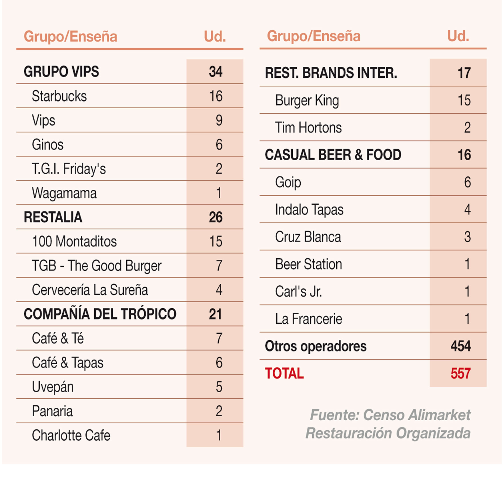 El Censo Alimarket Restauración Organizada recoge 557 establecimientos de restauración organizada en los seis códigos postales del centro de Madrid sobre un total de 2.180 locales para el conjunto de su término municipal. Hay que aclarar que la suma de estas zonas es ligeramente superior a los límites marcados por la división administrativa del Ayuntamiento para el Distrito Centro. En cualquier caso, cabe destacar como el fast food lidera el censo de restaurantes de cadena en el centro de Madrid , con 143 locales (26%), de los que 34 tienen una oferta basada en hamburguesas. Le siguen las cafeterías de cadena, con 133 unidades, los restaurantes temáticos de servicio a mesa (109 - 16%), las cerverías-tabernas (75) y los restaurantes singulares integrados en cadenas (65). Por operadores, destaca el liderazgo de Grupo Vips, con 34 locales de sus marcas (6%), seguido por Restalia (26), Compañía del Trópico (21) y Restaurant Brands International (17).