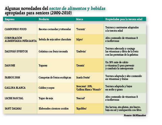 El progresivo envejecimiento de la población española, así como el paulatino incremento del poder adquisitivo de los seniors, está captando el interés de la industria alimentaria, que cada vez más invierte en productos adecuados a este grupo de edad. Se trata de alimentos que, bien por su textura, bien por sus nutrientes, aportan ventajas específicas para la tercera edad, aunque pueden ser consumidas por otros targets.