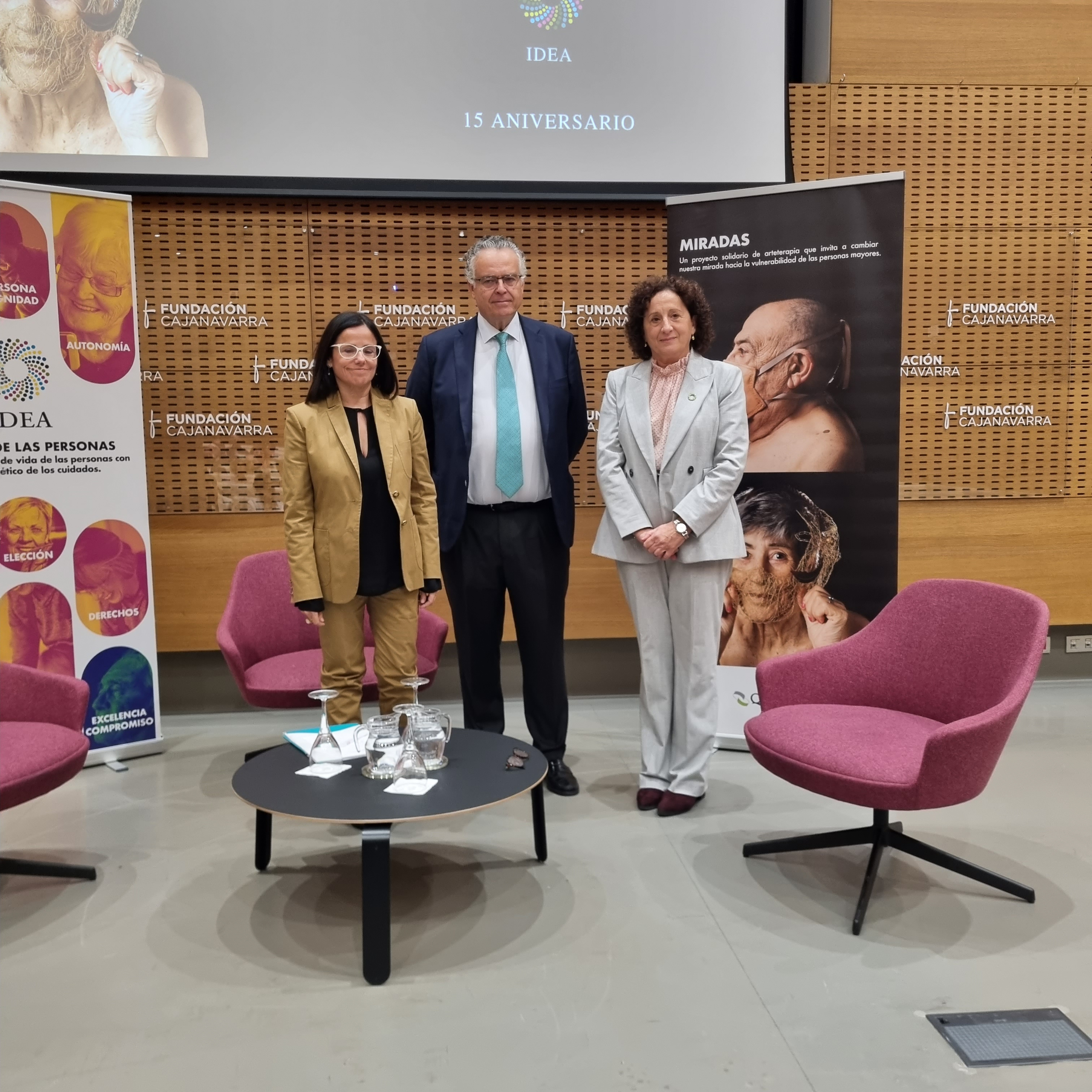 De izda. a dcha.: Cinta Pascual, presidenta de CEAPS; doctor Rafael Sánchez-Ostiz, CEO de IDEA; y Carmen Maeztu, consejera de Derechos Sociales del Gobierno de Navarra.